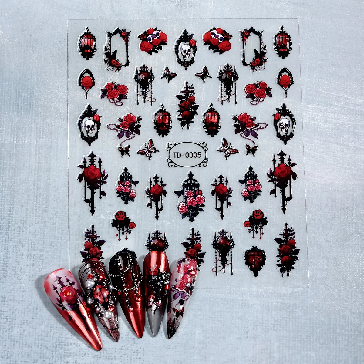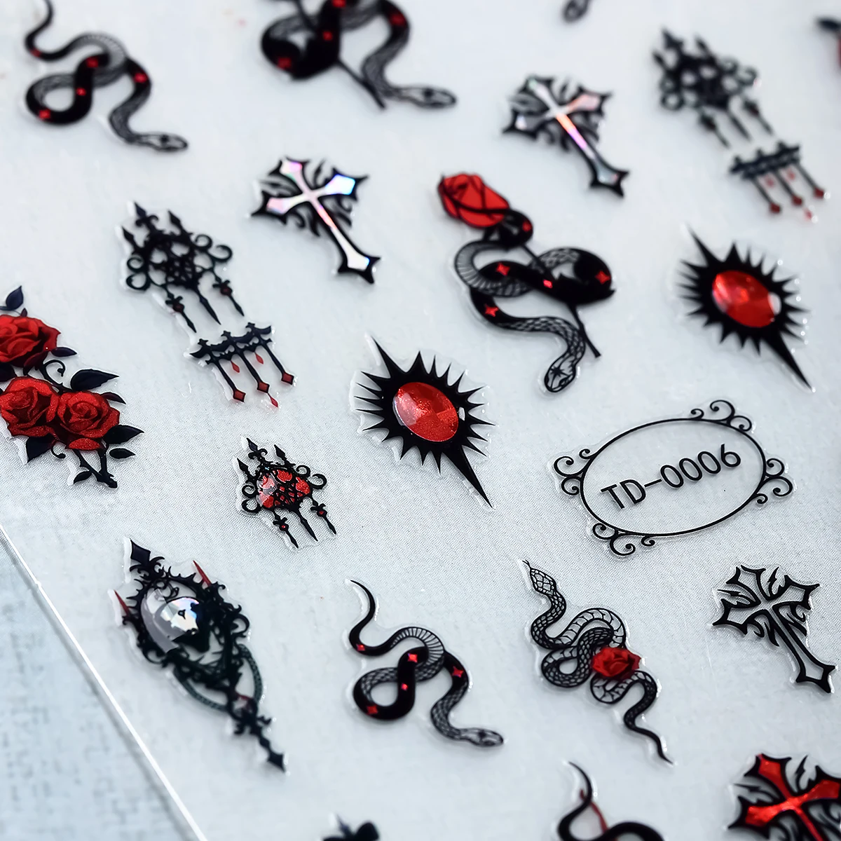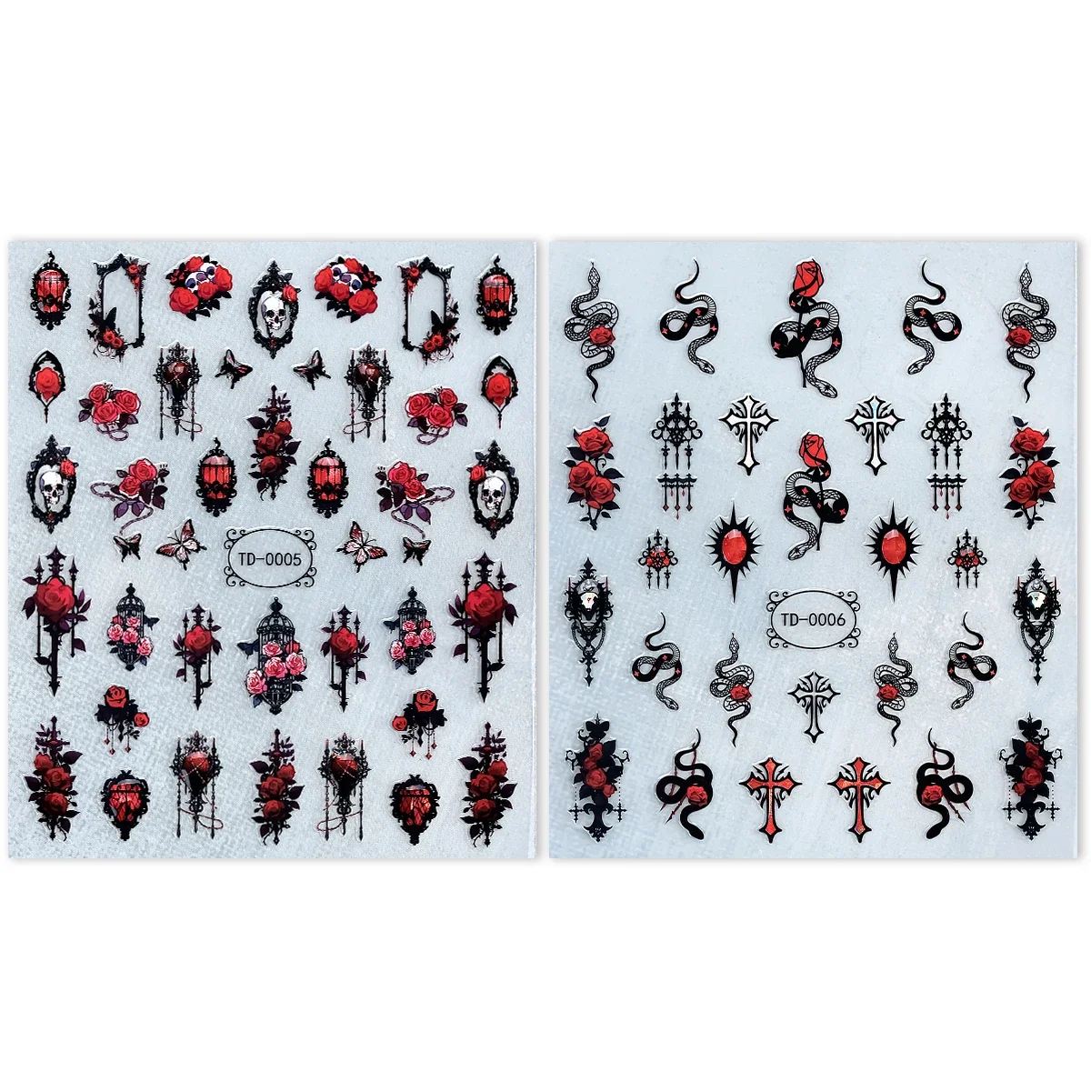 2pcs Black Red Gothic Halloween Nail Stickers 3D Skull Rose Snake Cross Nail Decals for Festival Nail Decor Self-Adhesive Slider